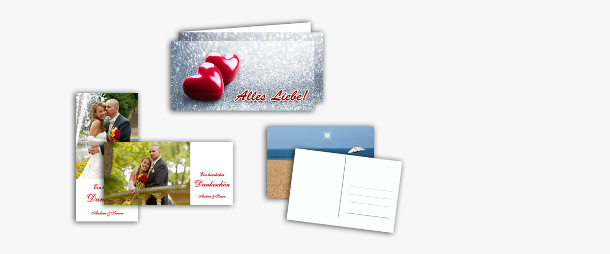 Gestalten Sie Postkarten mit unserer Bestellsoftware doch einmal selbst und sorgen Sie mit einer persönlichen Einladungskarte für individuelles Flair. Wir drucken Postkarten, Grußkarten, Hochzeitskarten oder Einladungen. Egal für welchen Anlass, ob für Hochzeit oder Taufe, Kindergeburtstag oder Kommunion, Jubiläum oder Jugendweihefeiern, mit einer Postkarte als Einladung überzeugen Sie Ihre Gäste schon bevor die Feier losgeht.