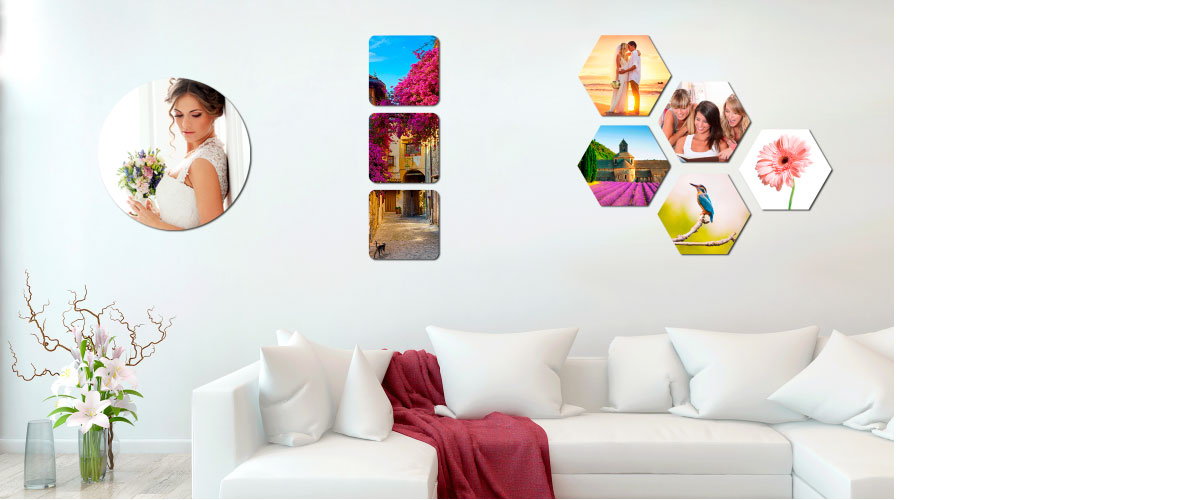 Wir bieten unsere Multi-Pics als Quadrat, Kreis und Hexagon an. Jede Variante hat ihren eigenen Reiz. Gestalte für Dein zu Hause Multi-Pics für mehrere Räume und Du kannst die einzelnen Pics durch die Magnetbefestigung immer wieder neu gestalten. Natürlich haften unsere Multi-Pics auch am Kühlschrank und allen metallischen Oberflächen.